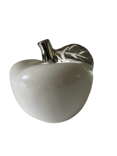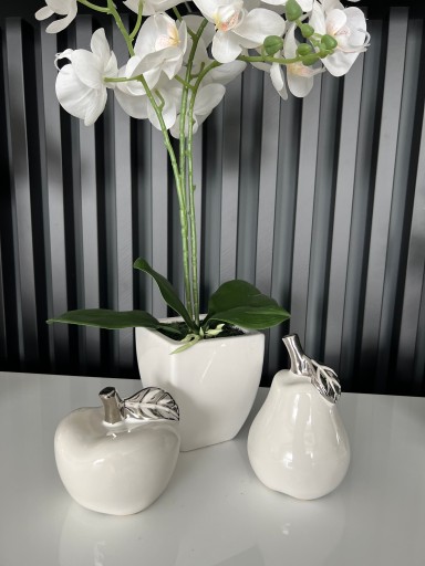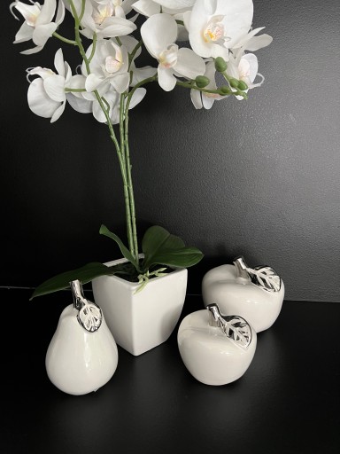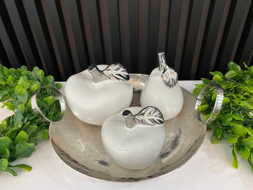 Gruszka i dwa jabłka w kolorze białym z elementami srebrnymi.