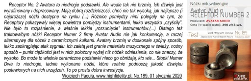 Pierwsze stopki Avatar Audio miały metalowe krążki z ceramicznymi kulkami, jednak dalsze badania pokazały, że te materiały dają bardzo przeciętny efekt. Metal i ceramika utwardzają i upraszczają barwę oraz ograniczają rozdzielczość. Obecne wersje stopek Receptor są nieporównanie lepsze, zarówno jeżeli chodzi o krążki jak i kulki. Drewno i korek dają dużo więcej szczegółów i bardziej naturalną barwę. Także pozostawienie swobody ruchu kulce na twardym metalowym podłożu nie jest najlepszym rozwiązaniem, bo jej mikroruchy generują własne wibracje. Dlatego w naszych stopkach kulki są osadzone nieruchomo.