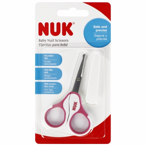Nożyczki dla niemowląt NUK są przeznaczone do bezpiecznego obcinania paznokci niemowlętom i dzieciom. Nożyczki tną dokładnie i bezpiecznie - mają zaokrąglone ostrza wykonane ze stali nierdzewnej. Uchwyty są pokryte antypoślizgowym, miękkim tworzywem. Nożyczki mają też ochronną osłonkę do przechowywania
