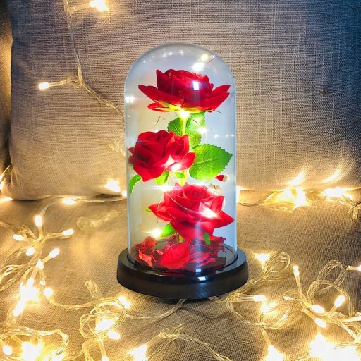 Nasza wieczna róża otoczona jest lampkami LED, które ją pięknie podświetlają. Dzięki temu prezentuje się niezwykle efektownie. Postawiony na nocnym stoliku, komodzie lub stole kwiat wytworzy magiczną atmosferę, która przypomni o Twoich uczuciach.