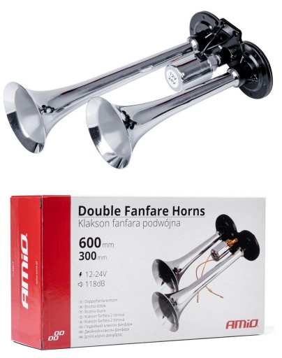 Klakson fanfara podwójna o bardzo głośnym, donośnym brzmieniu. Tego klaksonu po prostu nie da się nie usłyszeć. Całość wykonana z wysokiej jakości materiałów odpornych na warunki atmosferyczne o bardzo estetycznym wyglądzie. Ze względu na całkowitą uniwersalność, klakson może być zamontowany w każdym pojeździe wyposażonym w instalację elektryczną o napięciu 12V oraz 24V