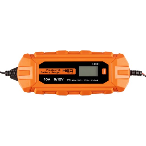 Prostownik automatyczny 10 A/160 W, 3 – 200 Ah, do akumulatorów kwasowych / AGM / GEL 11-893-1 marki NEO posiada możliwość ładowania akumulatorów nawet głęboko rozładowanych, będąc w stanie zregenerować je nawet od napięcia 3V. Polecany także do podtrzymywania ich w pojazdach mechanicznych i przedłużania żywotności. Kompatybilny z akumulatorami kwasowymi STD/AGM/GEL/LiFePO4. Prostownik oferuje sterowanie mikroprocesorowe oraz wbudowany wyświetlacz LCD, pokazujący dane o ładowaniu. Oddzielne ustawienia trybu ładowania zwiększają jego możliwości – podobanie jak sposobność zachowywania pamięci i danych podczas wymiany baterii. Posiada wbudowane zabezpieczenia, m.in. przed zwarciem końcówek, odwrotnym podłączeniem, przegrzaniem czy przeładowaniem akumulatora. Klasa izolacji IP65. Funkcje konserwacji, regeneracji i testu baterii przydają się profesjonalistom jak i fanom motoryzacji. Typ ładowania 10-stopniowy w pełni automatyczny. Prąd ładowania to 2A/10A. Napięcie obsługiwanych akumulatorów wynosi 6V/12V, a moc 160 W. Napięcie zasilania urządzenia to 220-240 V, 50-60Hz. Długość kabla wynosi 1,5 m. Prostownik funkcjonuje na baterii 3-200 Ah. Oferowany jest w zestawie z dodatkowymi kablami do podłączenia auta oraz instrukcją.