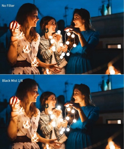 Dodatkowo dzięki filtrom Black Mist wszelkie niedoskonałości fotografowanych i filmowanych obiektów, szczególnie w fotografii portretowej, takie jak: odcienie skóry, zmarszczki, pory skórne itp. stają się zmiękczone i wygładzone, zanikają. Dookoła źródeł światła natomiast powstaje klasyczna, delikatnie wyglądająca poświata.