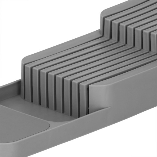 Organizer na noże posiada aż 9 przegródek. Dzięki temu można utrzymywać na nim zarówno małe noże do warzyw jak i większe do pieczywa czy mięsa. Dodatkowo został wyposażony w antypoślizgowy element, który stabilnie utrzymuje rączki noży.