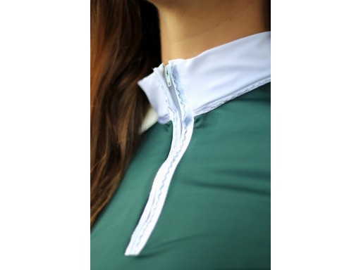 Wyjątkowo elegancka koszula konkursowa w kolorze szmaragdowej zieleni. Wykonana z najwyższej jakości tkaniny, która doskonale odprowadza wilgoć. Wykończona srebrną wypustką, zapinana z przodu na zamek. Na lewym ramieniu delikatny haft z logo firmy.