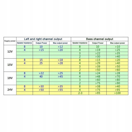 Użyj zasilacza DC: zasilacz 12-24 V, maksymalne wsparcie 50 W (lewy kanał) 50 W (prawy kanał) 100 W (kanał basowy) wyjście trzykanałowe