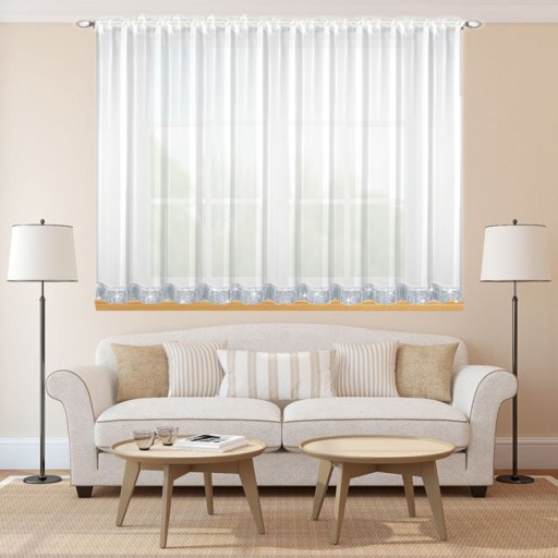 Piękna firana została uszyta z wysokiej jakości białego woalu i jest zdobiona w dolnej części szeroką na 6 cm taśmą z połyskującymi cyrkoniami. Z powodzeniem sprawdzi się także w klasycznych wnętrzach, którym doda szyku. Można ją powiesić również w pokojach urządzonych w stylu nowoczesnym . U góry firany została wszyta taśma marszcząca wraz z tunelem umożliwiająca montaż na karniszu rurkowym .