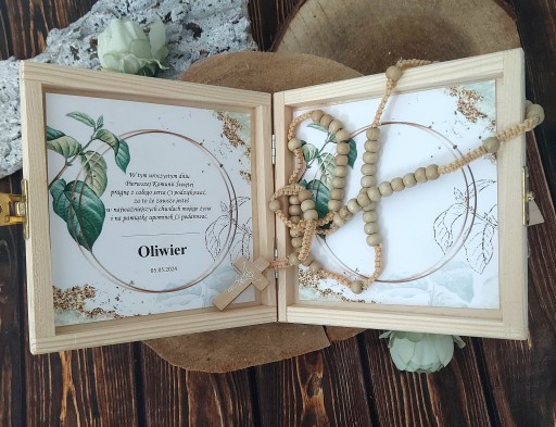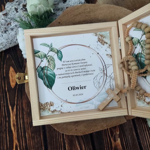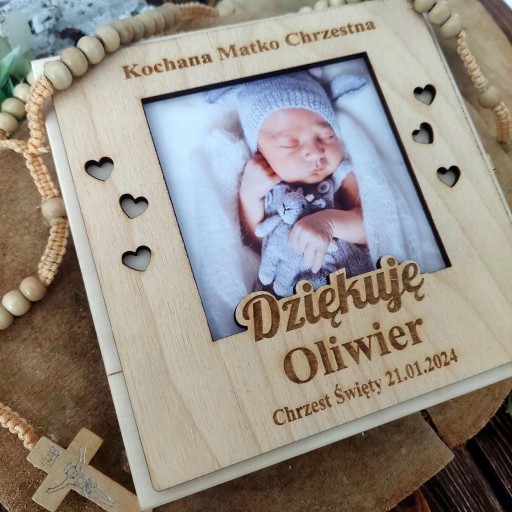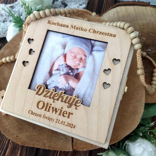 - na wieczku drewniana ramka z grawerowanym tekstem i zdjęciem
