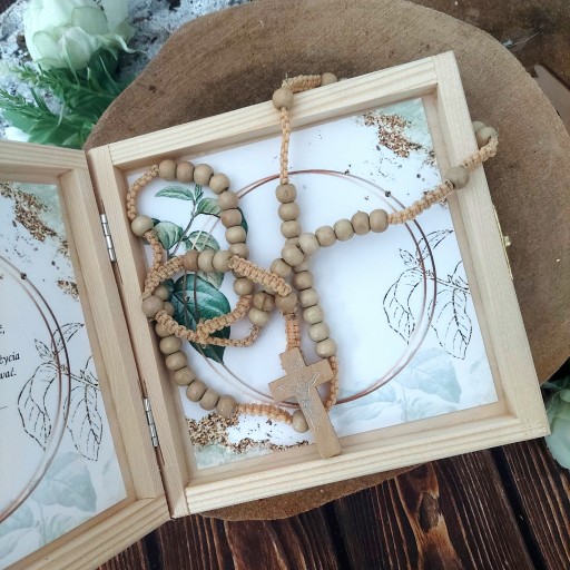 - * różaniec w kolorze naturalnym w komplecie ( w zależności od dostawy ma koraliki okrągłe lub podłużne, sznurek beżowy lub biały)