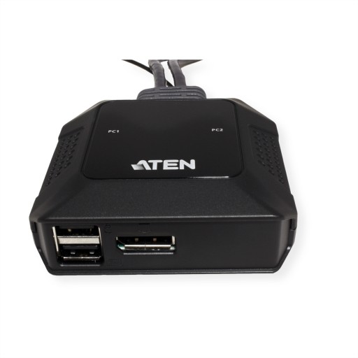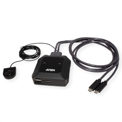 ATEN US3312 2-portowy przełącznik KVM USB C 4K DisplayPort z zewnętrznym selektorem portów został zaprojektowany z myślą o łatwej obsłudze i szybkim przełączaniu między dwoma źródłami urządzeń USB C z jednego zestawu klawiatury, myszy i monitora.