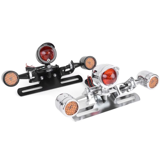 Lampa motocyklowa (stop i mijania) z kierunkowskazami i uchwytem tablicy rejestracyjnej , wykonana w całości z metalu.Lampa jest zarówkowa a kierunkowskazy ledowe (9 led)-KOLOR CHROM