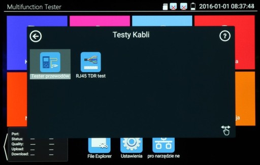 Porty szeregowe: RS-485 Protokoły: Obsługa ponad 30 protokołów RS485 : Pelco-D, Pelco-P, YAAN, YAAN-O, YAAN-1, SAMSUNG, PANASONIC, Lilin-FAST, Lilin-MLP2, MOLYNX, MINKING A01, Fastrax, CBC, LC-NEW, WV-CS850, SONY-EVI, LG-MULTIX, DAT-SD, VICON, Vcltp, DH-YTC 06, Santachi, Bosch OSRD, TeleEye DM2, HD 600, Hikvision, KALATEL ASC, AD 168(M-B), SAMSUNG SPD, Siemens, Cohu, MINKING B01, ALEC Prędkość transmisji: 150, 300, 600, 1200, 2400, 4800, 9600, 19200, 38400, 115200 b/s Test skrętki lub linii telefonicznej: Test połączenia kabli UTP lub telefonicznych, zakończonych wtykiem RJ-45 Test linii RS-485, RS-232: Testowanie danych z urządzenia sterującego (komendy są wyświetlane hexadecymalnie) Moduł Wi-Fi: 2.4 GHz Identyfikacja przewodu w wiązce: Test audio: Multimetr cyfrowy: Pomiar mocy optycznej: VLS (VFL) - wizualny lokalizator uszkodzeń włókien światłowodowych: Reflektometr TDR: Wykrywanie i lokalizacja miejsca przerwania kabla (tylko UTP) Praca jako źródło zasilania: