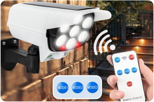 Możesz wygodnie sterować diodami LED wbudowanymi w atrape kamery za pomocą dołączonego do zestawu pilota. Diody LED posidają 3 tryby działania, które uruchomisz wybierając odpowiedni przycisk pilota: