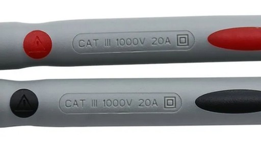 Przewody pomiarowe do miernika z jednej strony są zakończone kątowymi wtykami bananowymi z osłoniętymi końcówkami o średnicy 4mm, a z drugiej sondami pomiarowymi o długości 155mm.