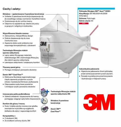 - zaawansowany elektretowy materiał filtru 3M™ zapewnia skuteczną filtrację połączoną z niskimi oporami oddychania
