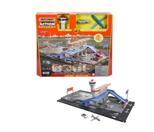 Dzieci mogą używać dołączonego pojazdu i samolotu, by odkrywać kolejne superfunkcje: aktywować bramkę przylotów, płytę lotniska, drzwi przesuwane i wieżę kontroli lotów. W zestawie znajduje się też obracana karuzela bagażowa i otwierana bramka. Lotnisko łączy się też z innymi zestawami Matchbox Action Drivers.