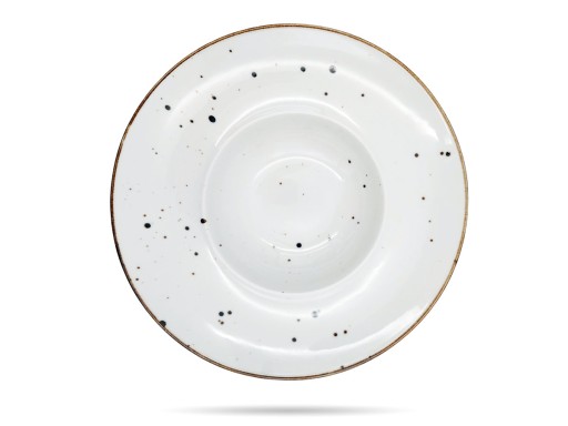 Głęboki talerz z szerokim rantem. Talerz do pasty, zdobiony ciemnymi, nakrapianymi wzorami. Taki talerz obiadowy, doskonale sprawdzi się zarówno w domu, jak i w profesjonalnej gastronomii. Nakrapiana seria Cottage to talerze, półmiski, salaterki, kubki i filiżanki w różnych odcieniach.