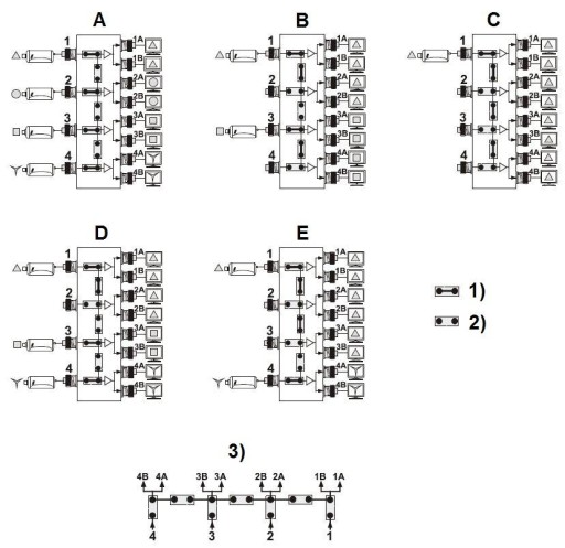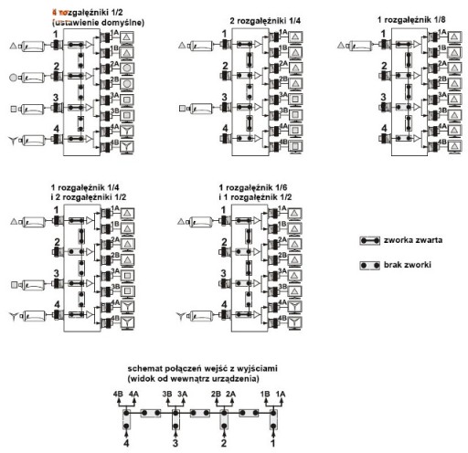 RV-4/8PR domyślnie ustawiony jest jako 4 niezależne rozgałęźniki video 1/2. Bardzo łatwo można go przekonfigurować za pomocą zworek, które są dostępne po zdjęciu pokrywy. Dostępne jest 5 kombinacji, które przedstawiono poniżej. Zworki pionowe uaktywniają poszczególne wejścia, natomiast zworki poziome łączą ze sobą wyjścia
