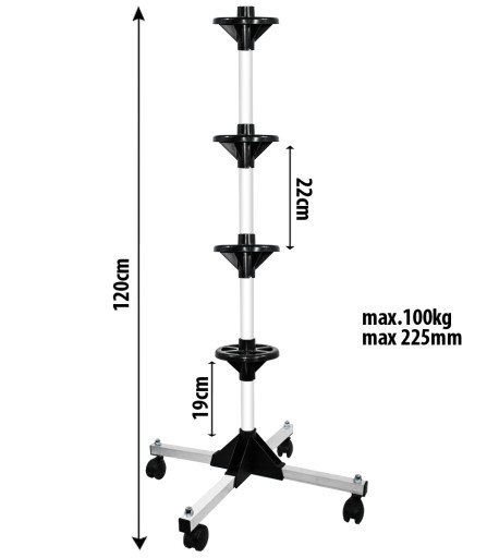 Bardzo praktyczny stojak na opony, felgi lub kompletne koła. Stojak wyposażony jest w koła dzięki którym łatwo możemy transportować. W garażu zajmuje on bardzo mało miejsca.Stojak utrzyma koła do 225mm szerokości i wadze jednego koła do 25kg.