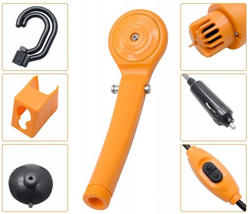 Samochodowy prysznic turystyczny składa się ze słuchawki prysznicowej połączonej za pomocą elastycznego węża z niewielką pompą wodną.