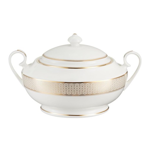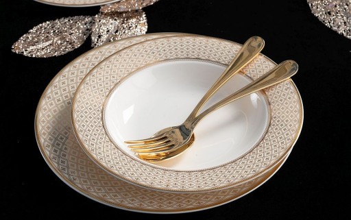 SERWIS OBIADOWY VERONICA TO ELEGANCKA PORCELANA W KLASYCZNYM FASONIE. CHARAKTERU I LEKKOŚCI DODAJĄ NACZYNIOM STOPKI ORAZ STYLIZOWANE UCHWYTY. ZASTAWA VERONICA WYKONANA JEST Z PORCELANY KOSTNEJ W CIEPŁYM ODCIENIU BIELI. JEST BOGATO DEKOROWANA MISTERNYM, ZŁOTYM WZOREM NA SZEROKIM PASKU O KREMOWYM TLE. DODATKOWO OBRZEŻA, UCHWYTY I STOPKI NACZYŃ ZOSTAŁY WYKOŃCZONE ZŁOTĄ LINIĄ.