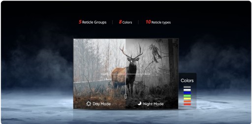 Istnieje 5 grup siatek celowniczych z 8 kolorami i 10 typów siatek celowniczych do wyboru w HIKMICRO ALPEX 4K. W celu zapewnienia większej wygody możliwe jest skonfigurowanie i zapisanie 5 profili siatki celowniczej.
