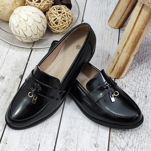 Eleganckie mokasyny damskie z modną ozdobą. Klasyczny fason w nowej odsłonie. Wykonane z miękkiej skóry ekologicznej doskonałej jakości. Zgrabny nosek optycznie wyszczupla stopę, Gumowa podeszwa sprawdzi się doskonale na wilgotnych miejskich nawierzchniach. Płaski obcas i miękka profilowana wkładka ze skóry naturalnej zadbają o komfort w trakcie chodzenia. Wystarczy wsunąć stopę i rozkoszować się wygodą przez cały dzień.