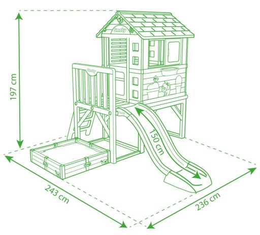 Uroczy domek jest umieszczony na siedemdziesięciu centymetrowych palach. Na taras prowadzi solidna drabinka, a szybkie zejście gwarantuje zjeżdżalnia. Aż sto pięćdziesiąt centymetrów radosnego zjazdu z góry na dół! Maluchy będą zachwycone!
