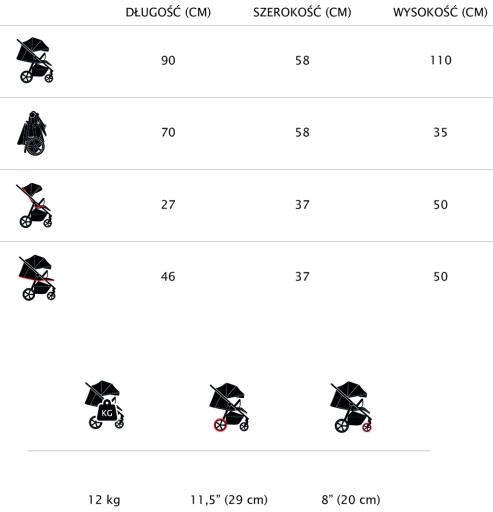 Waga: 12 kg Wymiary (dł./szer./wys.): Rozłożony: 90/58/110 cm Złożony: 70/58/35 cm Siedzisko: 27/37/50 cm Rozłożone Siedzisko: 46/37/50 cm Kółko przód: 8" / 20 cm Kółko tył: 11,5" / 29 cm