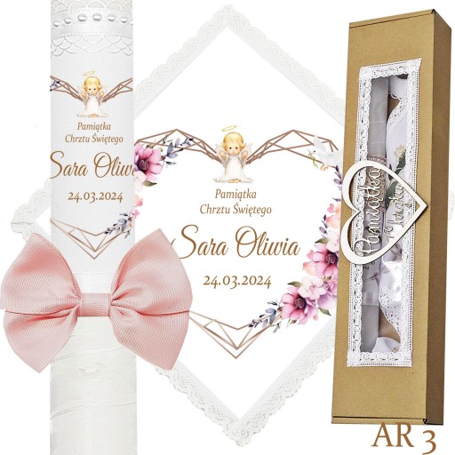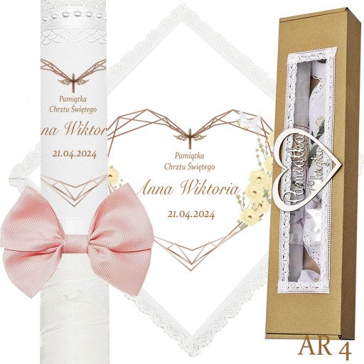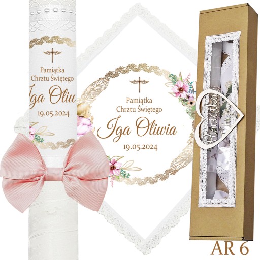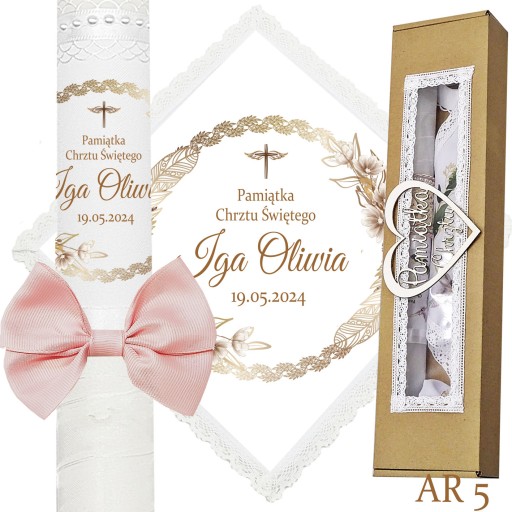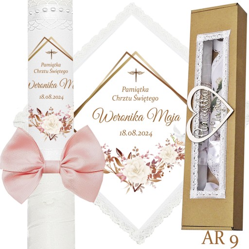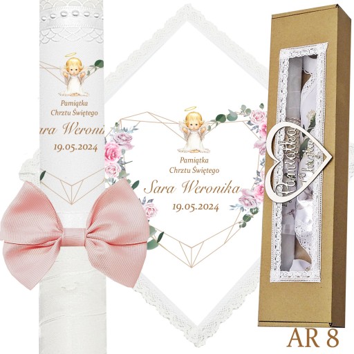 Świeca, która towarzyszy szatce, jest wytworzona z najlepszego wosku, dostarczanego przez polskiego producenta. Jej design przyciąga uwagę swoją prostotą i zarazem wyjątkowym wykończeniem. Świeca została ozdobiona wstążką szyfonową w kolorze białym, co dodaje jej wyjątkowego charakteru i uroku. Góra świecy została udekorowana koronką atłasową i białymi perełkami, co nadaje jej elegancji i szyku.Uroku dodaje matowa kokardka koloru różowego.