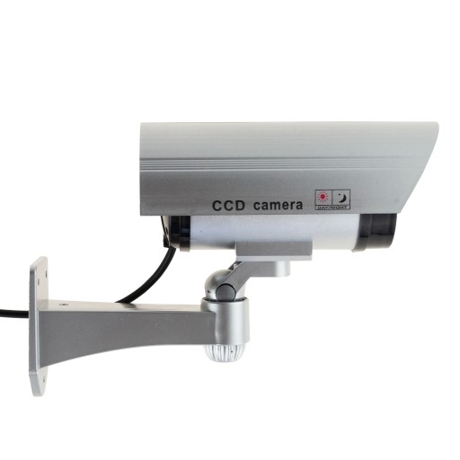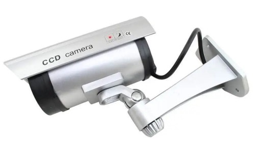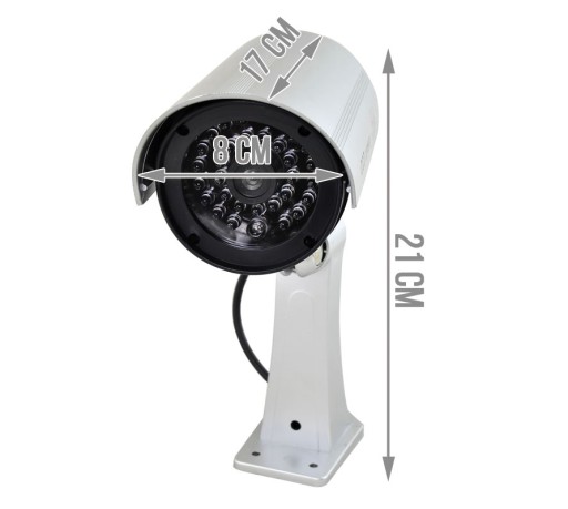 - REALISTYCZNY WYGLĄD - atrapa kamery przemysłowej do monitoringu. Dzięki zastosowaniu wszystkich elementów, które posiada prawdziwa kamera, tj. obiektywu, przewodu i uchwytu sprawia, że atrapa jest wierną kopią kamery przemysłowej. Nie wymaga drogich pozwoleń na monitoring ludzi. Urządzenie jest wyposażone we wbudowaną pulsującą, czerwoną diodę LED.