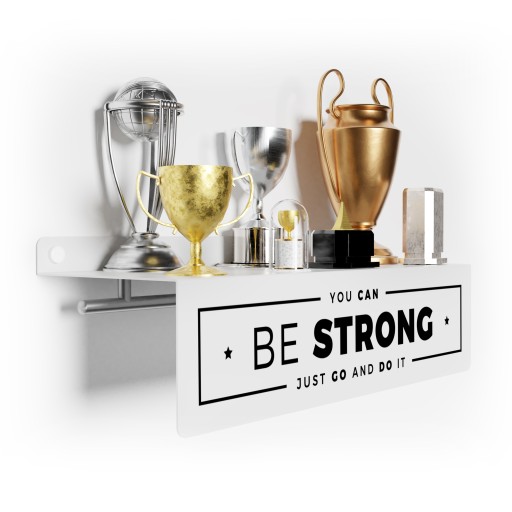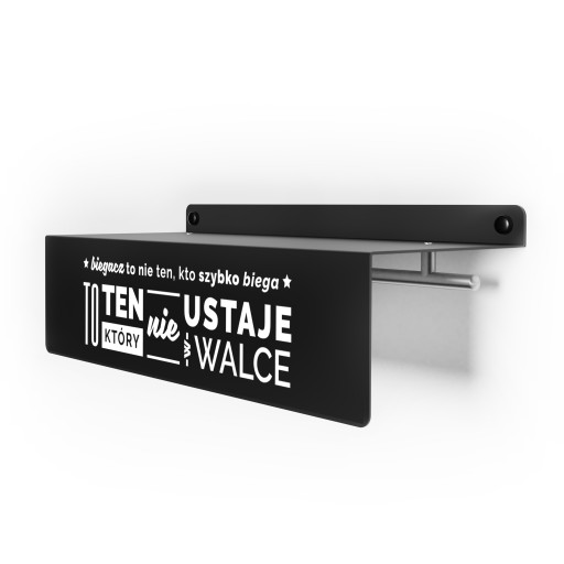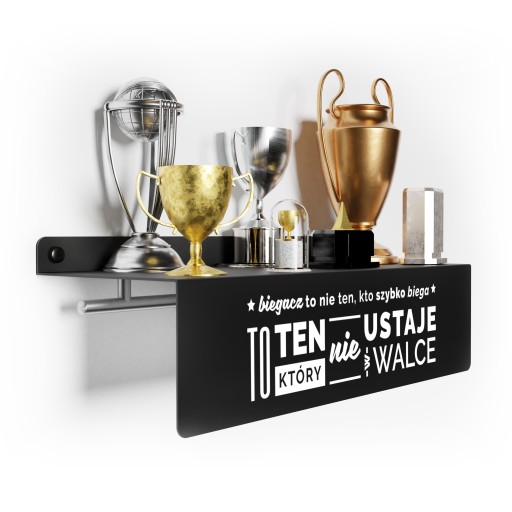 Metalowe wieszaki na medale z półką na puchary to unikalny design, dyskretna i prosta konstrukcja z napisem motywacyjnym wyciętym z folii. Uchwyt na medale został subtelnie zamontowany z tyłu.