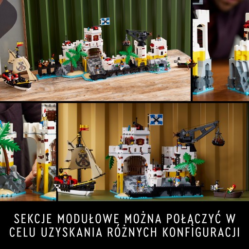 Odkrywaj ukryte skarby, budując klocek po klocku kultową twierdzę, w tym biuro admirała, pirackie więzienie i szereg tajnych pomieszczeń. Połącz modułowe sekcje, aby stworzyć różne konfiguracje i odegrać epickie sceny bitewne z działającymi armatami, ośmioma minifigurkami i fajnym pirackim galeonem z żaglami z wzorzystego materiału.