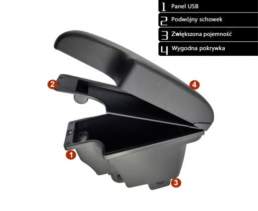 ✅ Zintegrowane porty USB i Podświetlenie LED: Podłokietnik posiada z przodu gniazda USB, dzięki którym można ładować 2 urządzenia na raz (smartfony, tablety itp.). Aby je zasilić należy podłączyć pierwsze gniazdo kablem z fabrycznym gniazdem USB lub z ładowaką do gniazda zapalniczki.