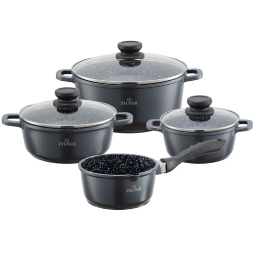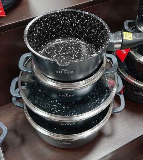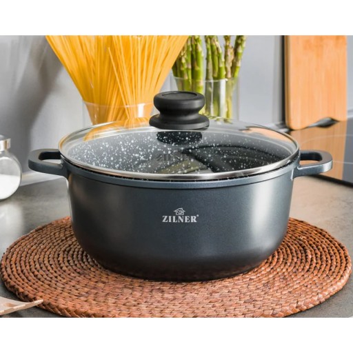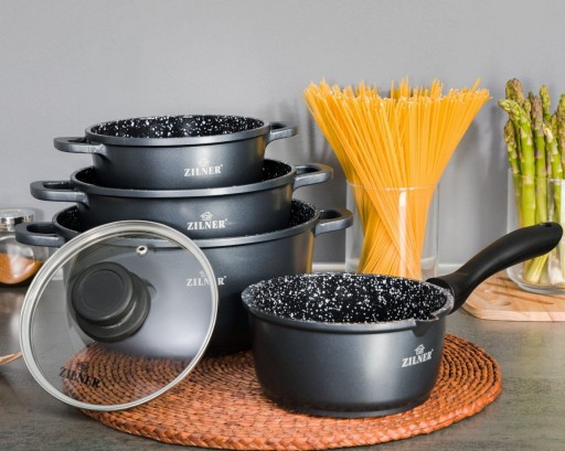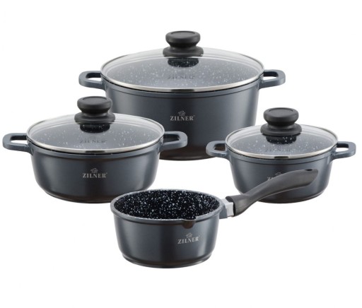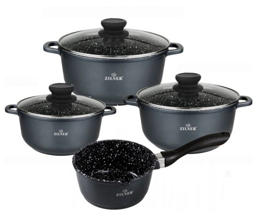 7 elementowe garnki ZILNER / EDEL HOFF wykonane z odlewanego stopu aluminiowego z anty-przywierającą wewnętrzną powłoką ceramiczną z domieszką miału granitowego (marble) wykonaną w procesie nanotechnologii, tworzącą niezwykle gęstą, zwartą oraz gładką warstwę na powierzchni. Powłoka która swoimi właściwościami przewyższa klasyczne powłoki teflonowe.