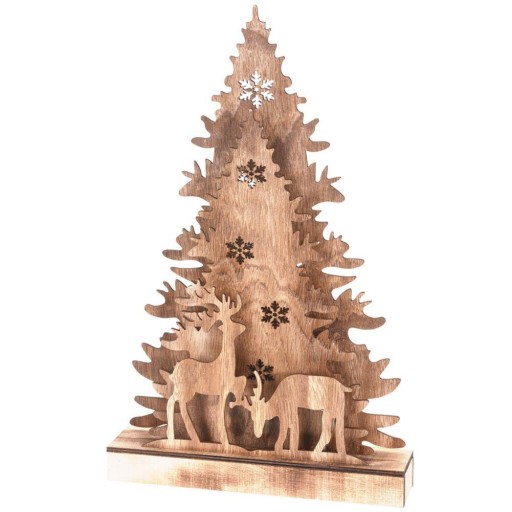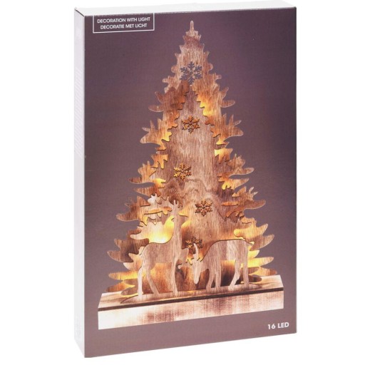 Świecąca, drewniana choinka 3D z lampkami LED. Do zastosowania wewnątrz pomieszczeń. Choinka prezentuje się bardzo efektownie, jest wyjątkowym elementem dekoracyjnym w okresie świąt Bożego Narodzenia. Możemy ustawić ją na komodzie, stoliku bądź szafce. Nada oryginalnego charakteru każdemu wnętrzu. Oryginalny produkt holenderskiej marki Home Styling Collection. Wyprodukowano zgodnie z europejskimi standardami.