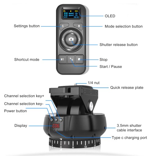3. Wiele funkcji fotografowania: bezprzewodowy pilot 2.4G, z wyświetlaczem wizualnym, do 100 metrów zdalnego sterowania w zakresie obrotu i pochylenia kąt poziomy, kąt nachylenia, prędkość, różne funkcje fotografowania.