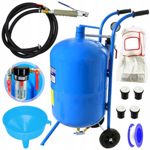 Mobilna piaskarka ciśnieniowa (syfonowa) o pojemności 76 litrów. Idealnie nadaje się do renowacji, konserwacji, pracy w serwisach blacharskich, mechanicznych, oraz zakładach produkcyjnych. Wyposażona w dysze i pistolet do piaskowania, zawór odcinający, manometr, wąż do piaskowania, lejek do napełniania zbiornika oraz maskę ochronną z szybką z pleksi.