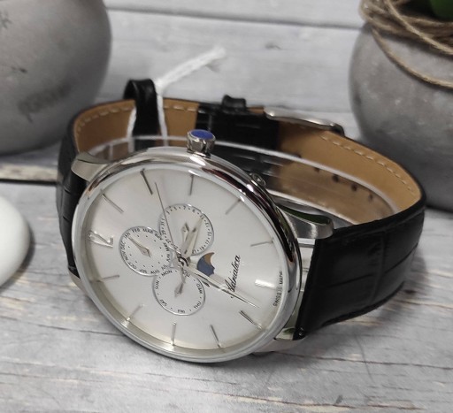 Męski klasyczny elegancki zegarek Adriatica z fazami księżyca A8269.5253QF - stalowa koperta, czarny skórzany pasek, srebrna tarcza, rozbudowany datownik, klasa szczelności 50M, szwajcarski mechanizm RONDA