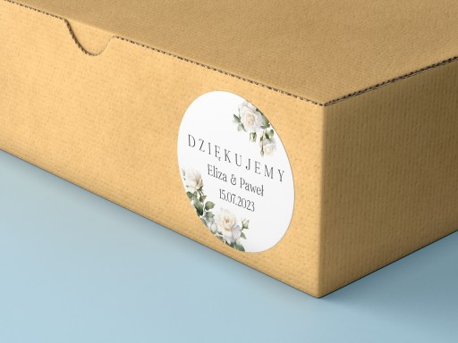 Przedmiotem oferty są ślubne, personalizowane, okrągłe samoprzylepne naklejki z motywem białych róż. Elegancka dekoracja upominków dla gości w ramach podziękowań.