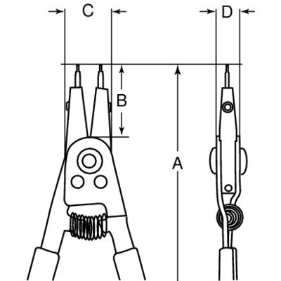 - Szczypce, w zależności od rozmiaru, mogą być używane do pierścieni wewnętrznych w zakresie od 8 do 100 mm i do pierścieni zewnętrznych w zakresie od 3 do 100 mm
