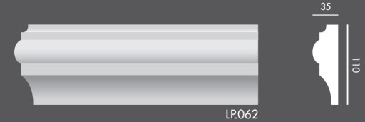 Listwa sztukateryjna zewnętrzna model LP062, wykonana jest z polistyrenu ekspandowanego EPS 200, popularnie zwanego styropianem. Gatunek EPS 200, jest wytrzymały i odporny na obciążenia. Materiał powleczony jest tynkiem sztukatorskim, odpornym na warunki atmosferyczne oraz potencjalne uszkodzenia. Listwy te są przystosowane do malowania na dowolnie wybraną barwę, farbami nie zawierającymi w swoim składzie rozpuszczalników.