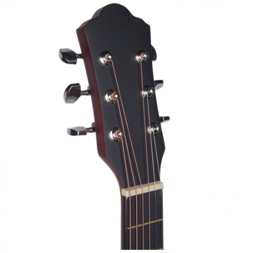 Mała gitara akustyczna dla każdego AG 34 to 18-progowa gitara akustyczna typu 1/2 przeznaczona głównie dla dzieci, które chcą rozpocząć swoją przygodę z tym instrumentem lub szukają gitary do zabawy. Model AG 34 to nieco mniejsza wersja pełnowymiarowej gitary, która idealnie nadaje się dla dzieci w wieku od ok. 7 do 10 lat. Krótszy i węższy gryf oraz mniejsze pudło rezonansowe sprawiają, że dzieciom gra się na niej wygodniej, niż na pełnowymiarowej gitarze. Instrument może być również z powodzeniem wykorzystywany przez młodzież i osoby dorosłe. Niektórzy celowo wybierają modele typu 1/2, gdyż są to gitary, które można zabrać ze sobą w każdą podróż, na ognisko czy domowe spotkanie z przyjaciółmi! Łatwa nauka gry na gitarze Instrument wykonany został z gatunków drewna charakteryzujących się dobrymi właściwościami akustycznymi, dzięki czemu brzmienie gitary jest bardzo przyjemne. Wygodny gryf oraz stosunkowo niska akcja metalowych strun pozwalają dość lekko i naturalnie układać palce na progach, nie męcząc przy tym ręki. Na uwagę zasługuje również sam wygląd gitary, która posiada ciemne, matowe wykończenie oraz klasyczne mechanizmy motylkowe. Tania gitara akustyczna Zastanawiając się, jaką gitarę akustyczną wybrać, warto zwrócić uwagę na model AG 34. To świetna gitara dla początkujących, ale nie tylko! Instrument jest solidnie wykonany, a samo granie na nim dostarcza dużej przyjemności. Idealnie nadaje się do nauki, ćwiczeń, muzycznych zabaw oraz realizowania muzycznego hobby. Warto również dodać, że to stosunkowo tania gitara akustyczna , która może być początkiem ciekawej przygody ze światem muzyki. Specyfikacja techniczna: Typ: gitara akustyczna 1/2 Długość: 87 cm (34") Szerokość: 30,5 cm Kształt korpusu: klasyczny Płyta wierzchnia: drewno sapele Tył i bok: drewno lipowe Podstrunnica: palisander Kolor płyty wierzchniej: naturalne drewno sapele Kolor pudła i gryfu: czarny, matowy Siodełko: plastikowe Znaczniki na gryfie: punktowe Struny: metalowe Mechanizmy motylkowe: klasyczne, odkryte Klucze: chromowane