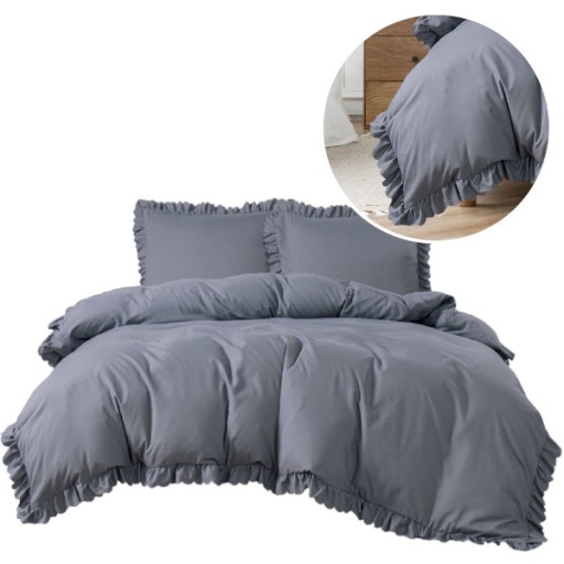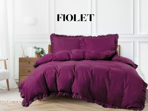 - Pościel z falbanką dostępna jest w formie kompletu, który obejmuje poszewkę na kołdrę oraz 2 poszewki na poduszki.