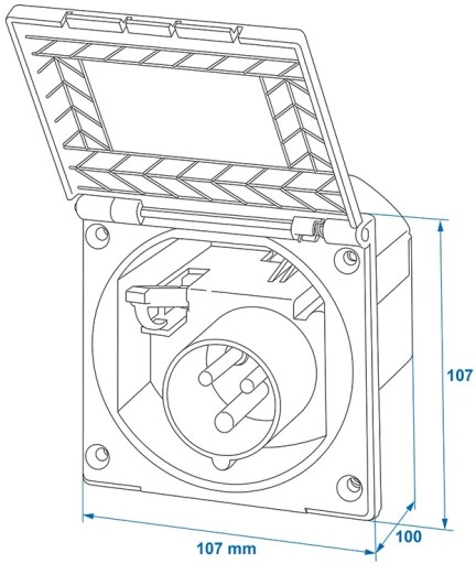 Gniazdo CEE przeznaczone do montażu na ścianie przyczepy kempingowej lub kampera.