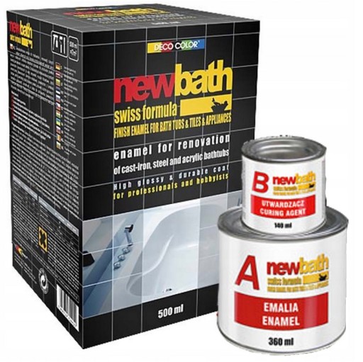 NEW BATH SWISS FORMULA to profesjonalny dwuskładnikowy preparat renowacyjny- emalia przeznaczona do renowacji wanien żeliwnych, emaliowanych i akrylowych.