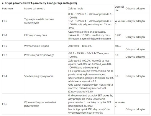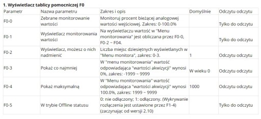 4. Domyślnie jest wyświetlany jako procent. Można również ustawić swój własny zakres wyświetlania poprzez F0-2 ~ F0-4.