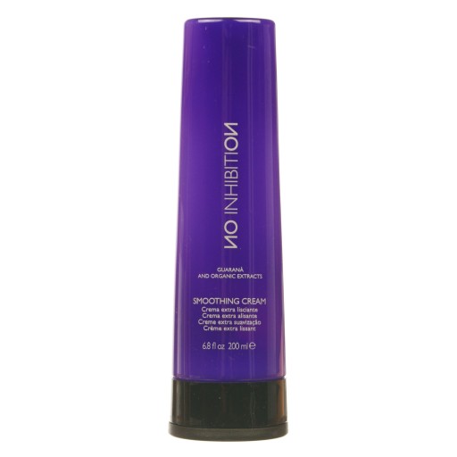 No Inhibition Smoothing Cream to wygładzający krem, który może być stosowany do każdego rodzaju włosów. Najlepiej sprawdzi się w przypadku matowych kosmyków ze skłonnością do puszenia się i elektryzowania. Po jego aplikacji włosy stają się wygładzone, wyprostowane, pełne naturalnego blasku i intensywnie nawilżone. Zawarte w recepturze silikony chronią pasma przed szkodliwym wpływem wysokiej temperatury wytwarzanej w trakcie stylizacji za pomocą akcesoriów fryzjerskich. Znajdziesz tu również ekstrakt z guarany, który działa nawilżająco, wzmacniająco i wygładzająco oraz odżywiający, regenerujący i nabłyszczający olej z awokado. Krem nie wymaga spłukiwania, więc jest łatwy i szybki w aplikacji. Dzięki temu możesz cieszyć się pięknymi włosami w każdej sytuacji. Ma lekką formułę, która nie obciąża włosów, a kosmyki wyglądają naturalnie, są miękkie w dotyku i dodatkowo pięknie pachną. Niewątpliwą zaletą kremu jest również jego wydajność. Wystarczy zaaplikować niewielką ilość, by włosy zyskały zdrowie i piękny wygląd.