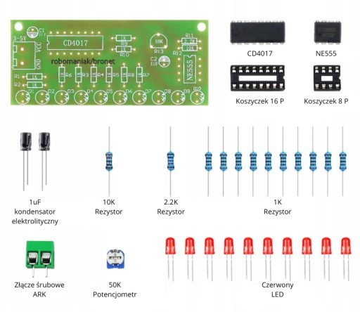 Moduł umożliwia zbudowanie układu z efektem płynącego światła. Prędkość regulowana jest za pomocą potencjometru.
