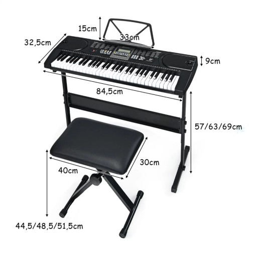 Przyjazna dla użytkownika konstrukcja: Podstawka w kształcie litery H sprawia, że klawiatura jest bardzo stabilna. Wyściełany i wygodny stołek łatwo się składa, gdy nie jest używany. Dzięki stojakowi na nuty i słuchawkom możesz grać w każdej chwili, nie przeszkadzając innym.